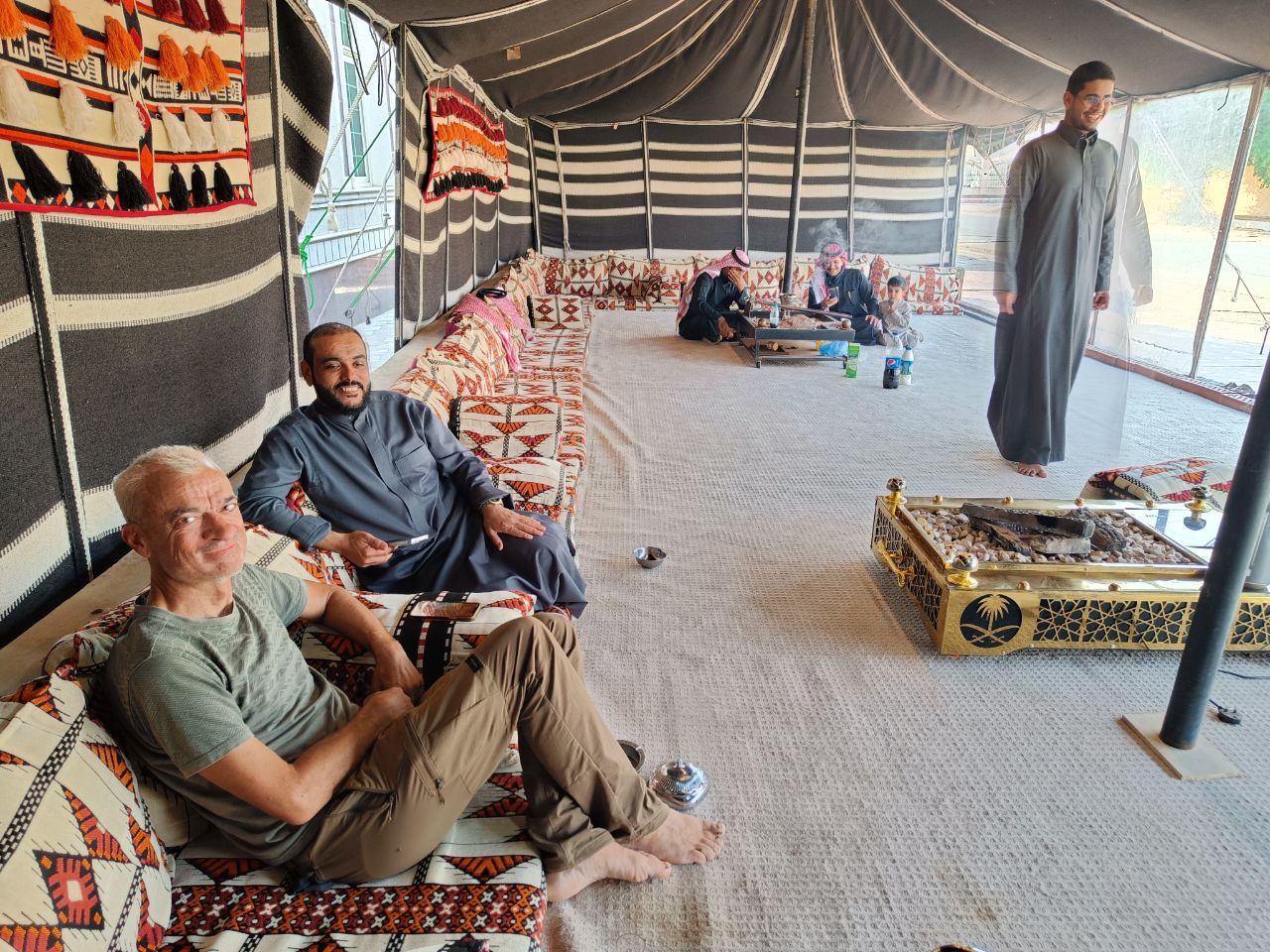 On décline poliment l’invitation car on a prévu de passer la nuit dans le désert. Mais la prochaine fois on acceptera, je suis curieuse de pouvoir rencontrer les femmes et discuter avec elles. Là sous la tente, il n’y a que des hommes. Mais aucune gêne avec moi, étrangère non voilée, on papote, on se serre la main pour se dire au revoir, il n’ y a pas de gène.